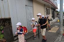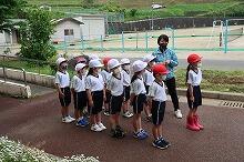 運動場への「避難」の後は、おまわりさんから、自分の命を守るために気をつけることや、不審な人に声を掛けられたときの「いかのおすし」について話をしていただきました。