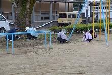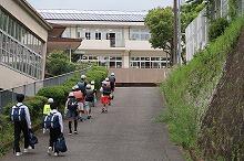 「PTA奉仕作業」できれいになった学校に続く坂道を登って子どもたちが登校してきました。今月末に行う「小中合同運動会」に向けて、全校児童生徒で「合同体育」を行います。この時期としてはやや肌寒さを感じます。