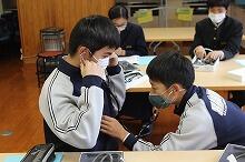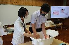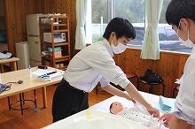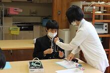 5月6日(金)、聖心ウルスラ学園高等学校看護科の先生にお越しいただき、中学3年生が「看護体験学習」を行いました。今回の体験学習では、聴診器や血圧計を実際に使い、心臓の鼓動を聴いたり血圧を測定したりしました。後半には、新生児の人形を使い、沐浴や授乳をさせたりしました。