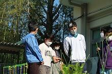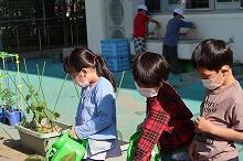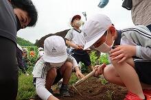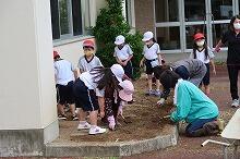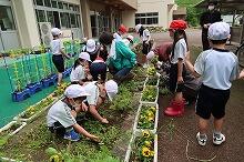 小学1・2年生が花壇やプランターに野菜の苗を植えています。ところが、大きくなっていた茄子(なす)と色づいていたミニトマトがなくなっていました。もしかしたら、先々週、学校に現れた子サルが食べたのかもしれません。