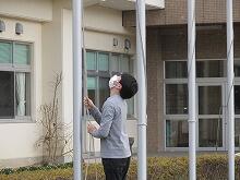 また、朝の活動後、生活委員会副委員長の生徒と生徒会副会長が「上野流あいさつ」ののぼりを立てていました。今日の天気と同じように、すがすがしい気持ちになれる朝の光景でした。