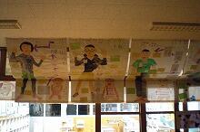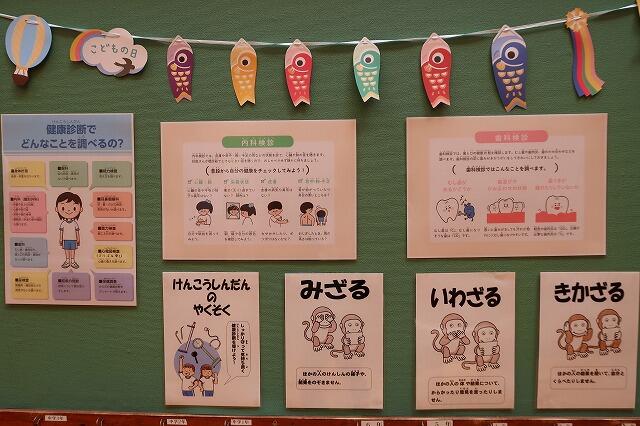 今日は大型連休の間の授業日です。5月になり、保健室横の掲示板も模様替えです。上野小・中学校では、4月末から5月中旬にかけて、健康診断を行います。鯉のぼりの装飾の下は、健診時に気をつけることなどが掲示してあります。