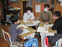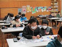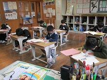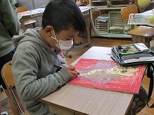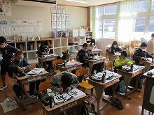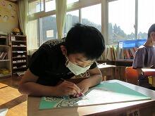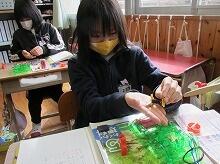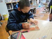 小学4年生が図工の授業で版画を制作していました。彫刻刀で版木を彫り、黒インクをつけて印刷した後、印刷したものに裏側から色をつけていました。作品の出来上がりが楽しみです。