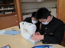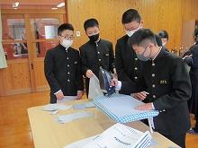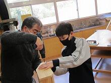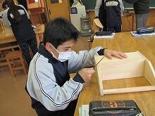 中学1年生は技術の授業で「木材加工」を勉強し、木製ラックを製作しています。今日の授業は製品の仕上げとして、ニス塗りの時間でした。授業を参観した時間は、ニス塗りの前に、板の表面を紙やすりで磨いたり、ずれているところを修正したりしていました。