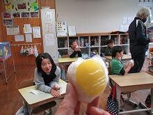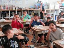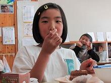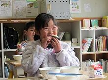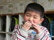 小学2年生は、生活科の授業で、ガラス瓶に入れた籾(もみ)を棒で突き、玄米にしました。今日はその玄米と5年生が稲刈りをした米を一緒に炊き、おにぎりを作って実際に食べました。子どもたちの表情からわかるように、とても美味しいおにぎりでした。