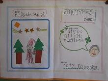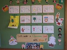 小学3年生の外国語活動では、担任の先生宛てのクリスマスのメッセージカードをかきました、掲示板に掲示してあります。I wish your merry christmas