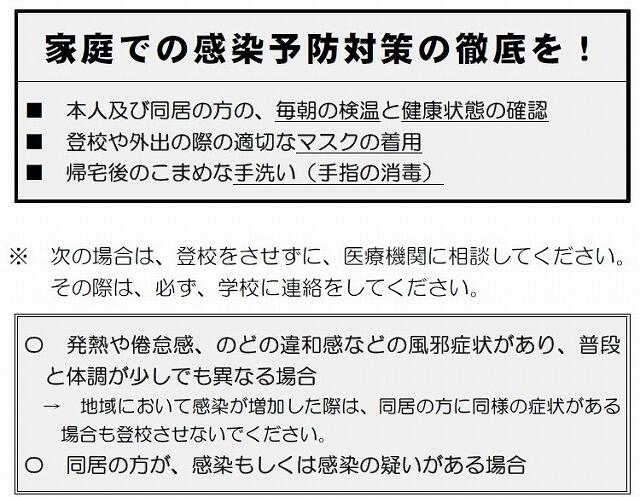 1月初めに配付しました、新型コロナウイルス感染症の予防についてのお願いの文書(県教育委員会)にも書いてありましたように、家庭での感染予防対策の徹底もお願いいたします。