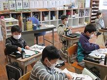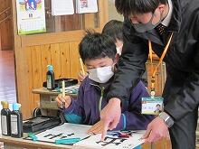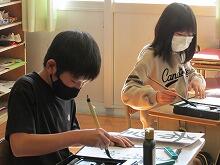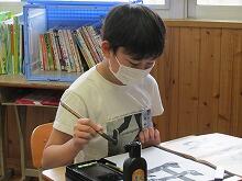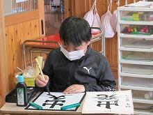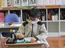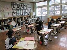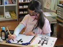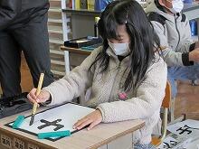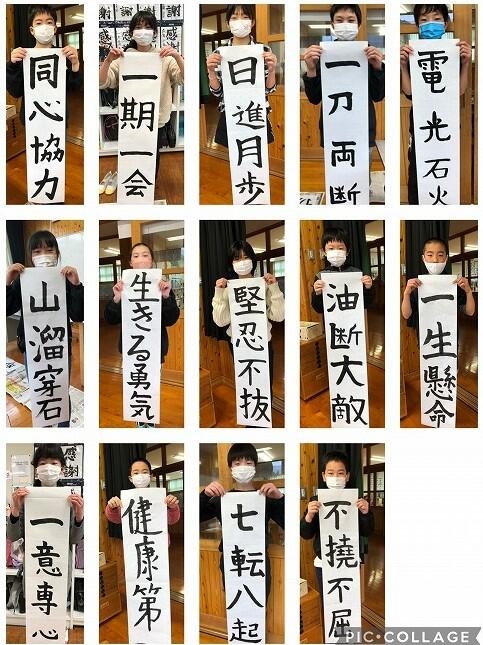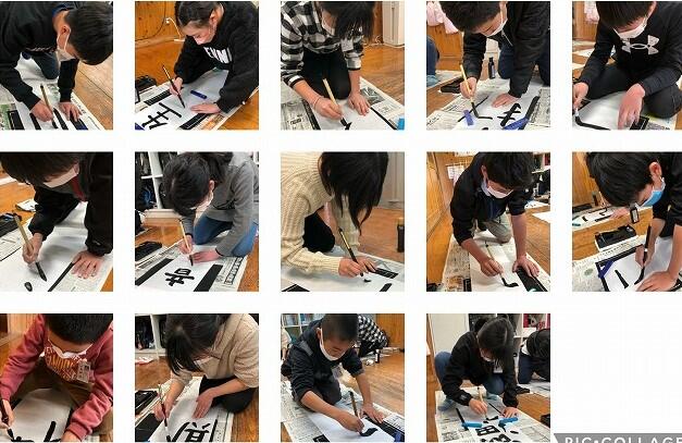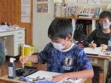 小学6年生が書写の時間に自分の好きな言葉を条幅紙に書きました。どうしてその言葉を選んだのかを話しながら、文字のバランスを考え、一生懸命書いていました。