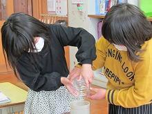 小学1年生は昨日の図工の時間に色水を作りました。その色水を昨日から外に置いていたところ今朝は凍っていました。そのようすを見たり氷を取り出して暑さを比べている子どももいました。