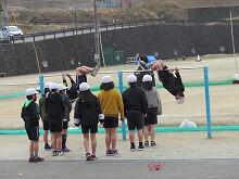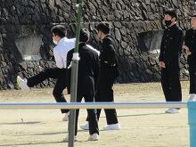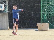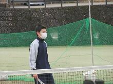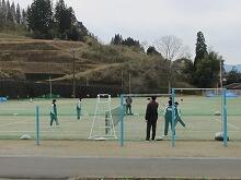 今朝の上野は曇っていますが、いつもほどの寒さはなく、上着がなくても過ごせます。運動場では中学1年生が保体の授業で「ソフトテニス」をしています。2名はソフトテニス部ですが、残りの3名は普段は竹刀を握っているので、まずはラケットに慣れ、ボールを相手に返すところから練習していました。学級担任の先生は子どもたちの奮闘ぶりを写真撮影です。