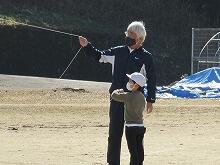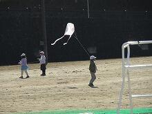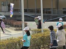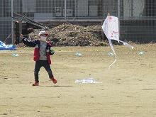 小学1年生が生活科の授業で凧揚げをしました。この凧は生活科の時間に作り、絵も描いてあります。今日の上野は晴れていて、正午頃の気温も12℃程度と比較的温かい日でした。凧揚げをしていた4時間目は適度に風も吹いていて、凧もよく揚がり、子どもたちも楽しそうでした。