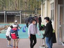 今日も上野の朝は寒く、まだ曇っています。登校した子どもたちは縄跳びやブランコで遊んだり、奉仕作業をしたりしています。