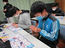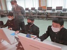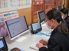 中学1年生の技術・家庭科(技術分野)の授業は、木材加工が終わり、「情報」の分野を勉強しています。今日は授業の初めにタッチタイピングを練習し、その後プログラミングの勉強をしていました。子どもたちが使っているのは、キャラクターを動かすための「命令」を選択し、それを並べたり繰り返したりしてプログラムを完成させます。試行錯誤を繰り返し、自分がイメージしたとおりにキャラクターが動くと子どもたちは喜んでいました。