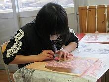 小学5年生が図工の時間に版画に取り組んでいました。今回の版画は「一版多色刷り版画」で、一枚の版木を刷って彫ることを繰り返しながら色を重ねていき完成させます。彫刻刀を上手に使い、次に使う色を考えながら制作を進めていました。出来上がりが楽しみです。