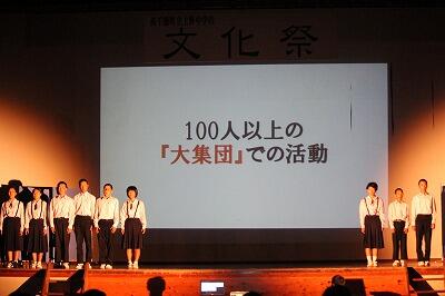 10月12日(土)に文化祭が行われました。午前中には、国語弁論、英語暗唱・弁論、各学年の発表、合唱がありました。各学年の発表は、1年生が職場訪問学習の発表、2年生が修学旅行の発表、3年生が劇「グッバイ・マイ」を発表しました。どの学年の発表も時間をかけて作り上げた素晴らしい内容でした。午後には、伝統芸能披露が行われました。1,2年生は上野臼太鼓踊り、3年生は神楽を披露しました。どちらも夏休みから、師匠の指導を受け、練習を積み重ねてきました。どちらも見応えのある伝統芸能を披露することができました。中学生にとって、充実した1日となりました。