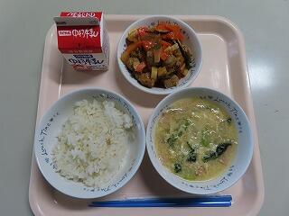 麦ごはん 厚揚げのあんかけ 小魚と大豆の揚げ煮 牛乳
