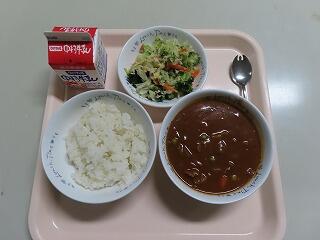 キーマカレーライス フレンチサラダ みかん 牛乳
