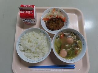麦ごはん 納豆サラダ つみれ汁 牛乳