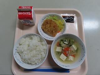 麦ごはん とん勝つ 添え野菜 豆腐のすまし汁 牛乳
