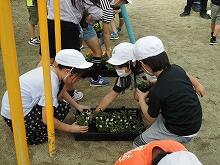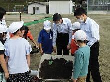 初冬を迎え、全校児童・生徒で花の植替をしました。今回は、小学生が「一人一鉢運動」として自分でパンジーかビオラの苗を選び、植木鉢に植え、その後は教室の近くで管理して育てます。小学1・2年生は中学2・3年生に手伝ってもらいました。