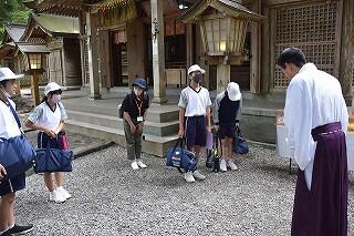 あいさつをした後、社殿で高千穂神社について学びました。国の重要文化財「鉄造の狛犬」も見せていただきました。