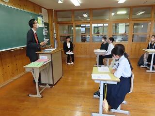 高千穂中に着くと、それぞれの学級の朝の会から参加しました。授業も一緒に受けます。