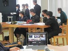 ICTを使った相互参観授業を行いました。今日の授業は中学3年生の社会科です。授業は、今年度、高千穂高校に整備されたICTラボ(通称 TーLABO)で行い、高千穂中学校と五ヶ瀬中等学校をインターネットでつなぎ、上野中の生徒が土呂久学習で学んだことを発表し、他校の生徒と意見を交換して考えを深めました。