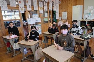 3月7日(火)、高千穂町総合政策課の方々が来校され、この春卒業する小学6年生に、特製の”しおり”をプレゼントしてくださいました。このしおりは、台風などで折れたスギの木の活用方法を考えていた地域おこし協力隊の方が初めて企画されたものです。