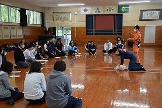 講師には、西臼杵広域行政組合消防本部の方に来ていただき、携帯電話やAEDを用いた最新の救助法について練習をすることが出来ました。
