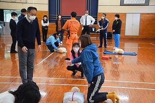 令和5年度の始業を前に、小学校と中学校の全職員による「心肺蘇生法」の研修を行いました。