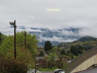4月7日(金) 令和5年度1学期始業の日の朝。天気は雨時々くもりで、南に見える高千穂の山々にもうすい雲がかかっています。子どもたちは元気に登校してきました。