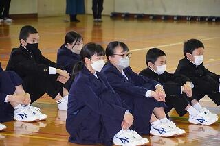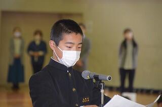 3月24日(金)、上野体育館に全校児童生徒が集まり「修了式」を行いました。式では、「」はじめに各学年の代表児童生徒に校長が「修了証」を授与しました。その後、代表児童と代表生徒が今年度の反省と次の学年への決意を発表しました。