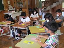 持ってきた半紙をすべて使うほど繰り返し練習する児童もいました。できあがった作品は授業が終わった後、教室に掲示してありました。