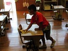 上野小学校と上野中学校には「上野流清掃の心得」があり、校内には「床をみがき 汗を流して 心を洗う これ即ち 洗心なり」と書いた掲示物があります。清掃の時間になると、放送で「上野流清掃の心得」が流れ、子どもたちは自分の担当場所で黙想をして聞きます。15分間無言で清掃し、終わりも黙想をして個人で反省します。人数は少ないのですが、一人一人が無言で一生懸命に床を磨き。汗を流しています。この時間は、先生たちも子どもたちと一緒に無言で清掃をしています。