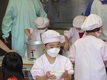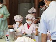 小学1年生も2学期から給食当番をしています。給食着を着ることにもまだ慣れていないので、当番の準備からまず始まります。給食室から自分たちで給食を運び、慣れない手つきで器についでいました。今日が2日目でしたが、子どもたちはがんばっていて、予想よりもうまくできていたと思います。子どもたちだけでの配膳はまだできませんが、2学期が終わる頃にはうまくなると思っています。