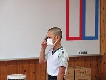 教室で朝の会を終えた子どもたちは、体育館で始業式を行いました。上野地区の体育館はバスケットボールのコートが2面とれるほど広い体育館です。今日は感染防止のために、間隔を大きく取りました。また、始業式は代表の児童1名と生徒1名による2学期の抱負発表、校長の話のみを行い、校歌は歌いませんでした。その後の諸連絡では、養護教諭が感染防止のために、マスクの正しい付け方や消毒の仕方、こまめな手洗い・うがいについて話をしました。