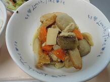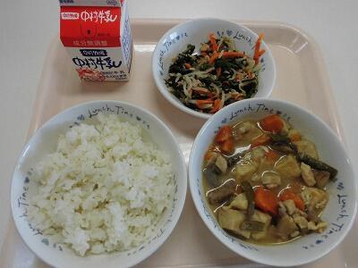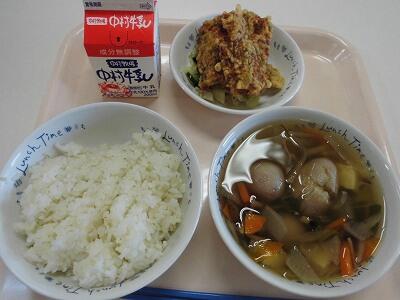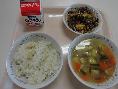 今日の献立の「五目スープ」には、地域の方が自宅で作り、学校に届けてくださった「アンデス赤」という品種の芋が使ってあります。普段食べるジャガイモと違ったおいしさや食感がありました。