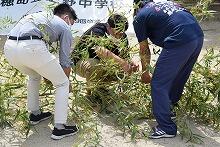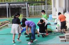 小中合同運動会が終わり、1時間目は、「修学旅行合同学習会」に行った中学2年生を除いた全校児童・生徒で片付けを行い、玉入れの球や万国旗を拭いたり、体育倉庫を片付けたりしました。また、中学生は6時間目も片付けをしました。今日の上野は朝は曇っていましたが、次第に日差しが強くなり、外に干していたはちまきなどもよく乾きました。