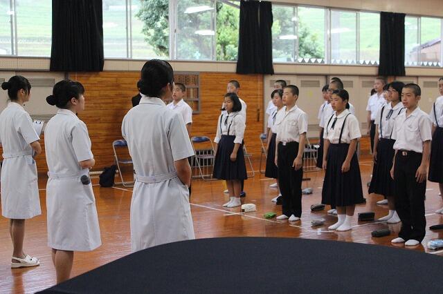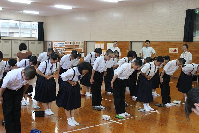 今日は中学校の礼法指導がありました。講師として来られたのは、日章学園高校の先生とトータルエステティック科の5名の生徒のみなさんでした。「あいさつの仕方」「礼の仕方」「発声練習」などを本格的に学び、練習しました。日常の生活で今日学んだことが発揮できるとすばらしいですね。