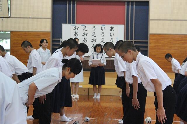 今日は中学校の礼法指導がありました。講師として来られたのは、日章学園高校の先生とトータルエステティック科の5名の生徒のみなさんでした。「あいさつの仕方」「礼の仕方」「発声練習」などを本格的に学び、練習しました。日常の生活で今日学んだことが発揮できるとすばらしいですね。