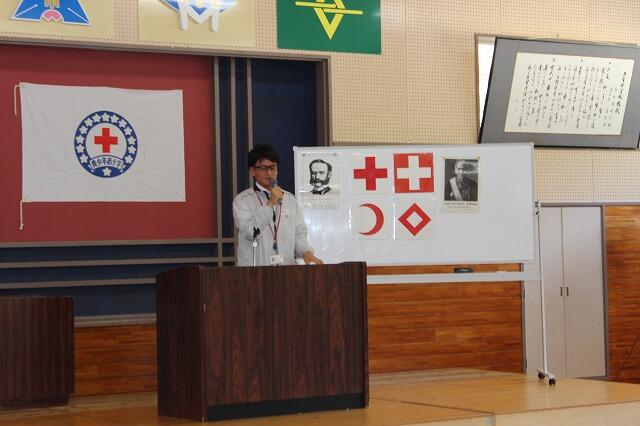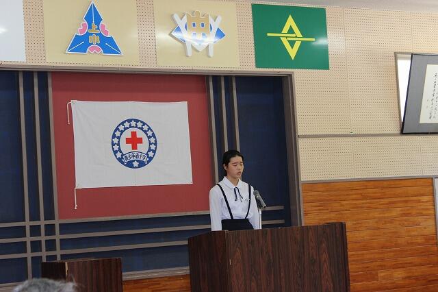 上野中学校では、JRC登録式が行われました。JRCとは、「Junior Red Cross ( = 青少年赤十字 )」の頭文字をとったものです。青少年赤十字は、児童・生徒が赤十字の精神に基づき、世界の平和と人類の福祉に貢献できるよう、日常生活の中での実践活動を通じて、いのちと健康を大切に、地域社会や世界のために奉仕し、世界の人びととの友好親善の精神を育成することを目的として、さまざまな活動を学校教育の中で展開しています。