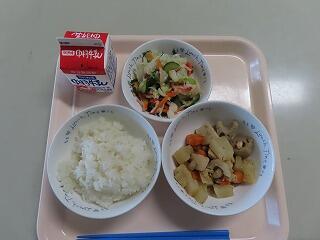 今日の給食はぬくもりランチです。お米、栗、キュウリ、椎茸、ほうれん草が地域の食材として使われています。