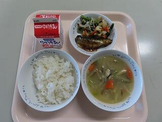 麦ごはん いわしおかか煮 小松菜の和え物 みそけんちん汁 牛乳