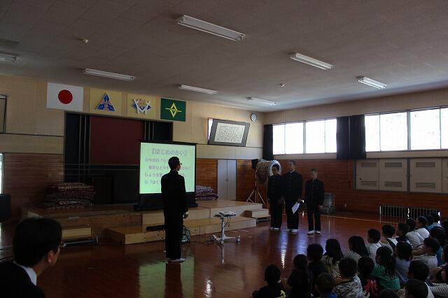 全校児童生徒向けに交通安全教室が行われました。最初に、高千穂町交通安全協会の職員の方と上野駐在所の上米良さんから車の危険性についての話と実演をしていただきました。