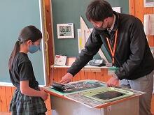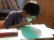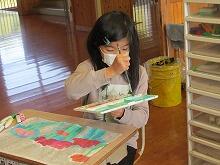 小学4年生が図工の授業で版画を制作していました。彫刻刀で版木を彫り、黒インクをつけて印刷した後、印刷したものに裏側から色をつけていました。作品の出来上がりが楽しみです。