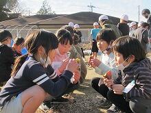 小学2年生は、生活科の授業で、ガラス瓶に入れた籾(もみ)を棒で突き、玄米にしました。今日はその玄米と5年生が稲刈りをした米を一緒に炊き、おにぎりを作って実際に食べました。子どもたちの表情からわかるように、とても美味しいおにぎりでした。