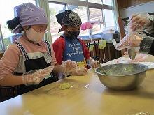 焼き芋が焼き上がるまでの時間、小学1・2年生は生活科の授業で「ふかし芋の茶巾絞り」を作りました。子どもたちはピーラーを使ってサツマイモの皮をむくところからしました。