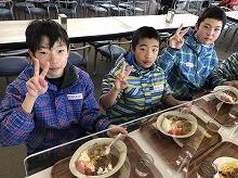 雪山体験学習の午前の部が終わり、昼食の写真などが届きました。スキーやスノボードを楽しんでいるようです。