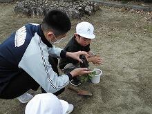 初冬を迎え、全校児童・生徒で花の植替をしました。今回は、小学生が「一人一鉢運動」として自分でパンジーかビオラの苗を選び、植木鉢に植え、その後は教室の近くで管理して育てます。小学1・2年生は中学2・3年生に手伝ってもらいました。