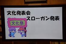 今朝、中学校では1時間目の授業の前に委員会集会を行い、11月・12月の生徒会や委員会活動について役員の生徒が説明しました。また、今週末行う「文化発表会スローガン」の横断幕も披露しました。